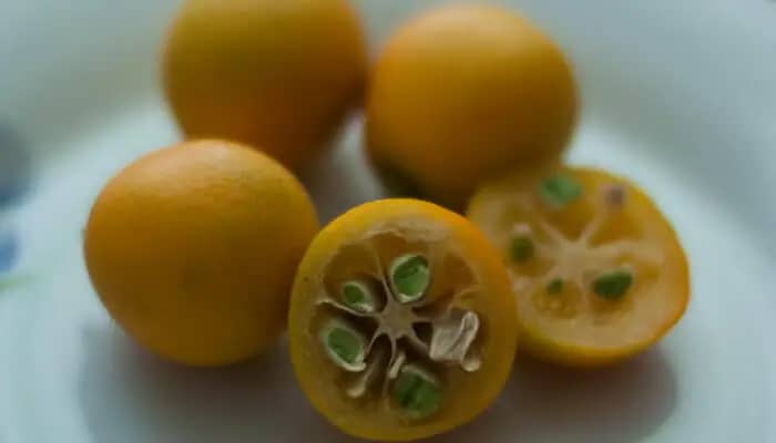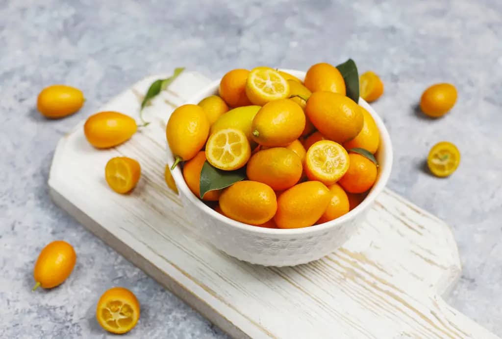 Кумкват - это маленькие цитрусовые, всего 2-4 см длиной. Кожура оранжевого цвета, тонкая. Фрукт содержит сочную мякоть с косточками. Мякоть с отделениями и сильный приятный аромат напоминает другие цитрусовые. Плод употребляется в пищу вместе с кожурой.