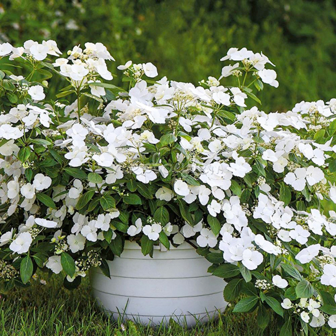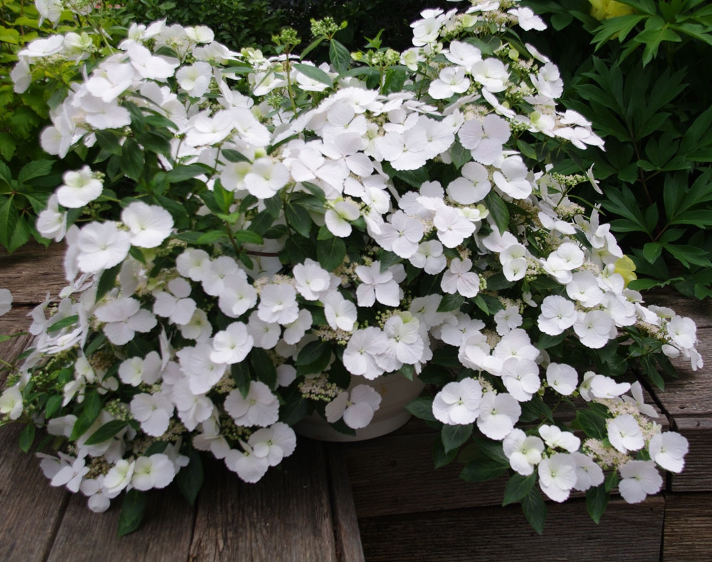 İlk çiçəklənmədən sonra yeni tumurcuqlarda yeni terminal çiçək qönçələri görünür və bununla da çiçəkləmə müddəti payıza qədər uzanır.Çiçəkli bitki bağda daha geniş istifadə sahəsinə malikdir və parlaq ağ rəng məsumluğu və saflığı, lütf və zərifliyi simvollaşdırdığı üçün ideal bir toy çiçəyi ola bilər.Çiçəklənmələr soyuq havalarda təmiz ağ, çox vaxt çəhrayı rəngli böyük, zərif, steril çiçəklərlə bəzəyir. Çiçəklərin sayı 8-dən 10-a qədər steril, məhsuldar 330. Apreldən iyun-sentyabr aylarına qədər təbii çiçəkləmə dövrüdü. Çiçəklənmə hündürlüyü 8,5 sm, eni 13,5 sm, orta hündürlüyü 50 sm, eni 100 sm.
